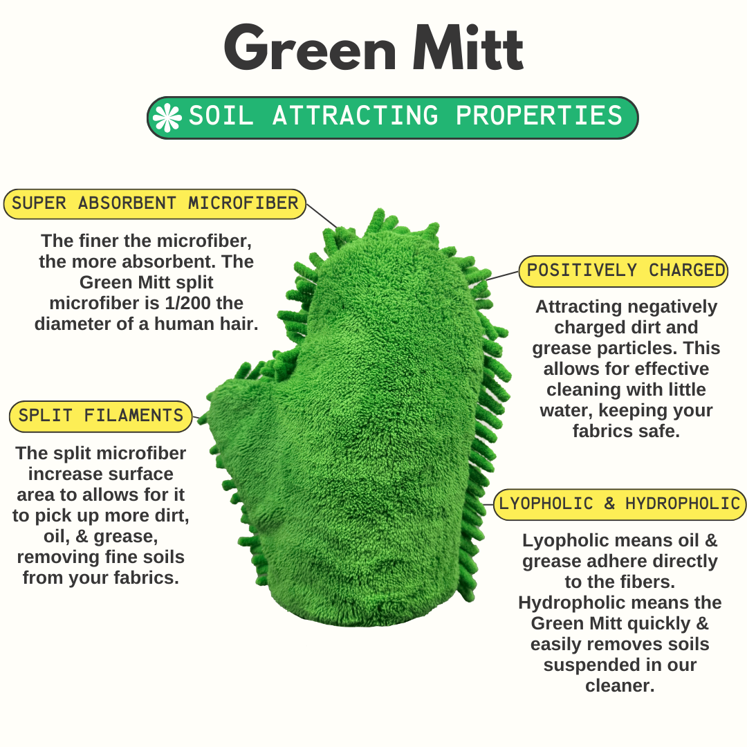 It's the split fiber, and the size of the individual filaments working in conjunction with the spaces between them acting like hooks that does the work. They pick up and hold the dust and dirt, and absorb the liquid. For these reasons, the Green Mitt is a superior soft surface cleaning tool. Paired with Clean Safe Products Super Concentrate, you get the world's easiest soft surface cleaning solution.