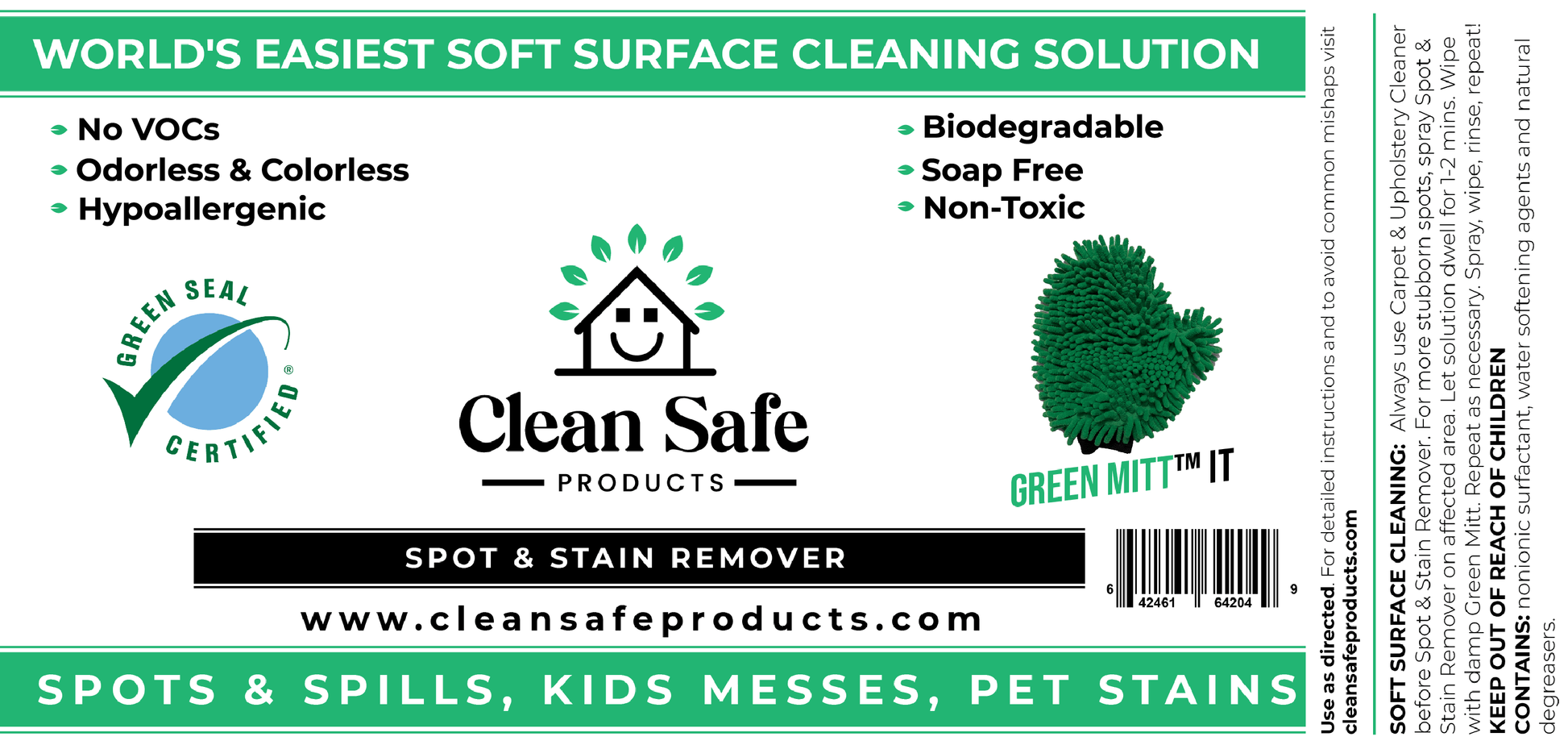 Our super effective cleaning concentrate and our ultra absorbent Green Mitt work together as a team to be the easiest way to remove soils from your soft surfaces. The Carpet & Upholstery Cleaners role is to attack soil with the goal of loosening, dissolving, and separating them from the fibers. The role of the Green Mitt is to physically pick up and carry away the soils from the surfaces.